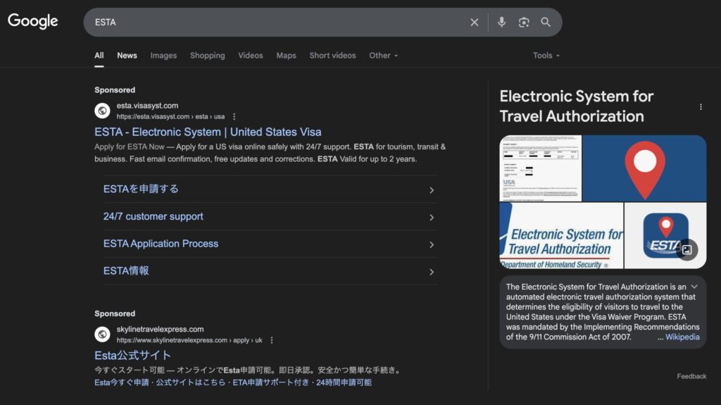 Googleなどで「ESTA 申請」と検索すると、一番上に「広告」や「スポンサー」と書かれたサイトがいくつか表示されます。